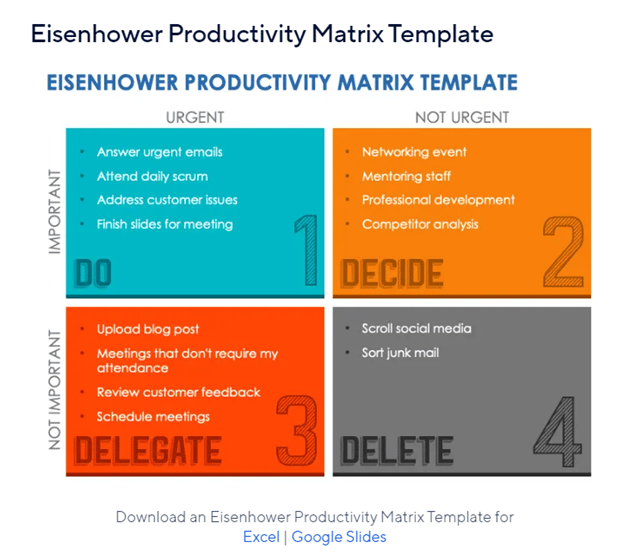 Think about it as a flywheel of tasks. Step #3 – Prioritize the listNow is when the fun begins –prioritizing and getting it done. This step is where to identify what to work on for today, that will make a difference. A tool that I personally use and have recommended to others is the Eisenhower Matrix. The Eisenhower matrix was recommended to me by my SCORE counselor when I was spiraling and overwhelmed with things to do for my business. I was caught in an endless cycle of working on little tasks like emails and social posts when I should have been developing a sales plan. I was bouncing from task to task, and not making any progress. The business was suffering. The Eisenhower matrix allowed me to keep track of tasks but, more importantly, not be distracted by the little things. We gravitate towards tasks that we can check off the list and then never get to the big stuff that will make a real impact. It works like this: Tasks are classified into 4 quadrants: